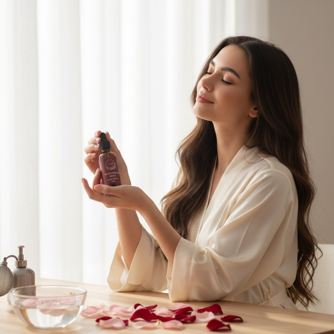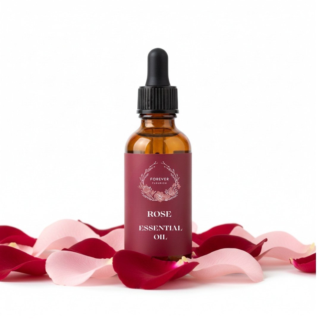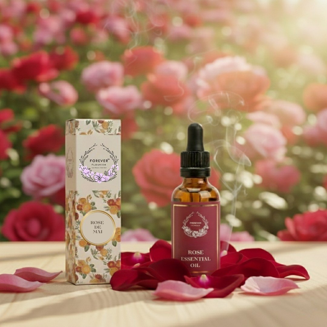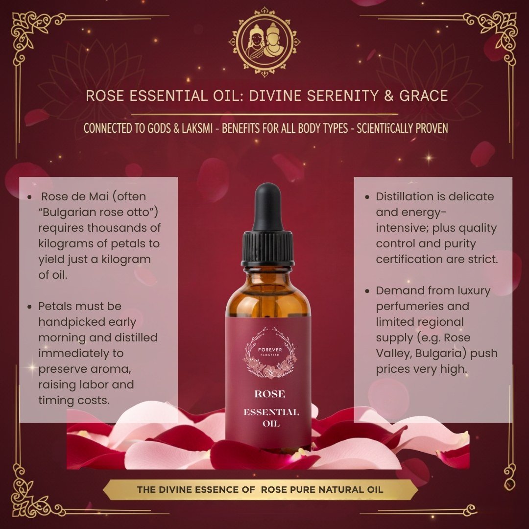 extracted by steam distillation from fresh Bulgarian roses. Also known as गुलाब का तेल, it is celebrated in Ayurveda for its soothing fragrance and powerful healing properties. This oil deeply hydrates and rejuvenates the skin, reduces blemishes, enhances glow, and strengthens hair while adding natural shine. Widely used in aromatherapy, massage, and diffusers, it calms the mind, eases stress, and creates a serene environment. Spiritually, rose oil is associated with Goddess Lakshmi, the goddess of prosperity, abundance, love, and purity. Ideal for meditation, puja rituals, and self-care, it balances body, mind, and soul while opening the heart chakra. Forever Flourish brings you the essence of divine energy and natural beauty in every drop.