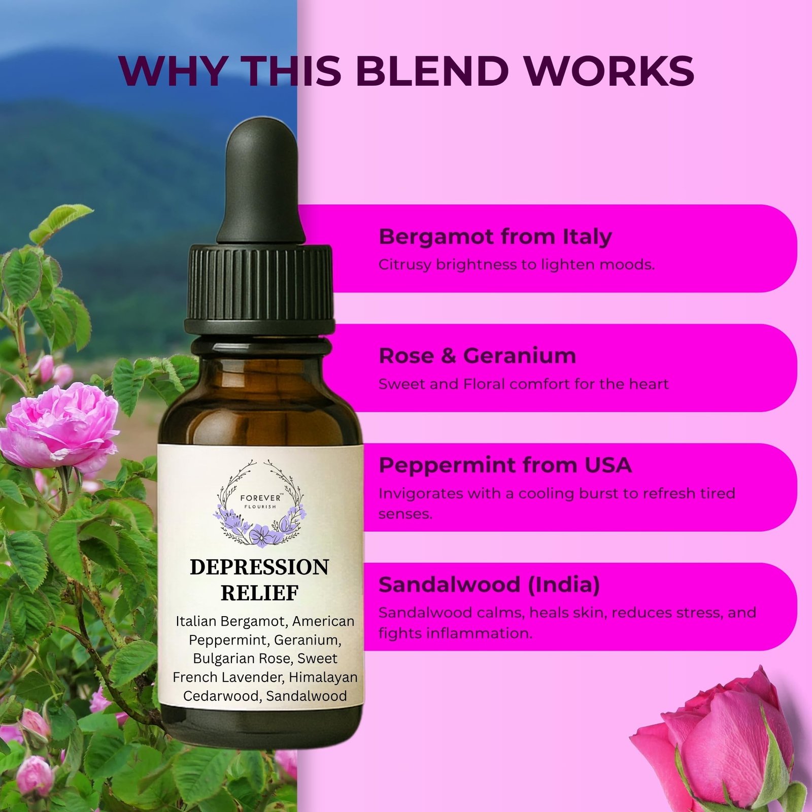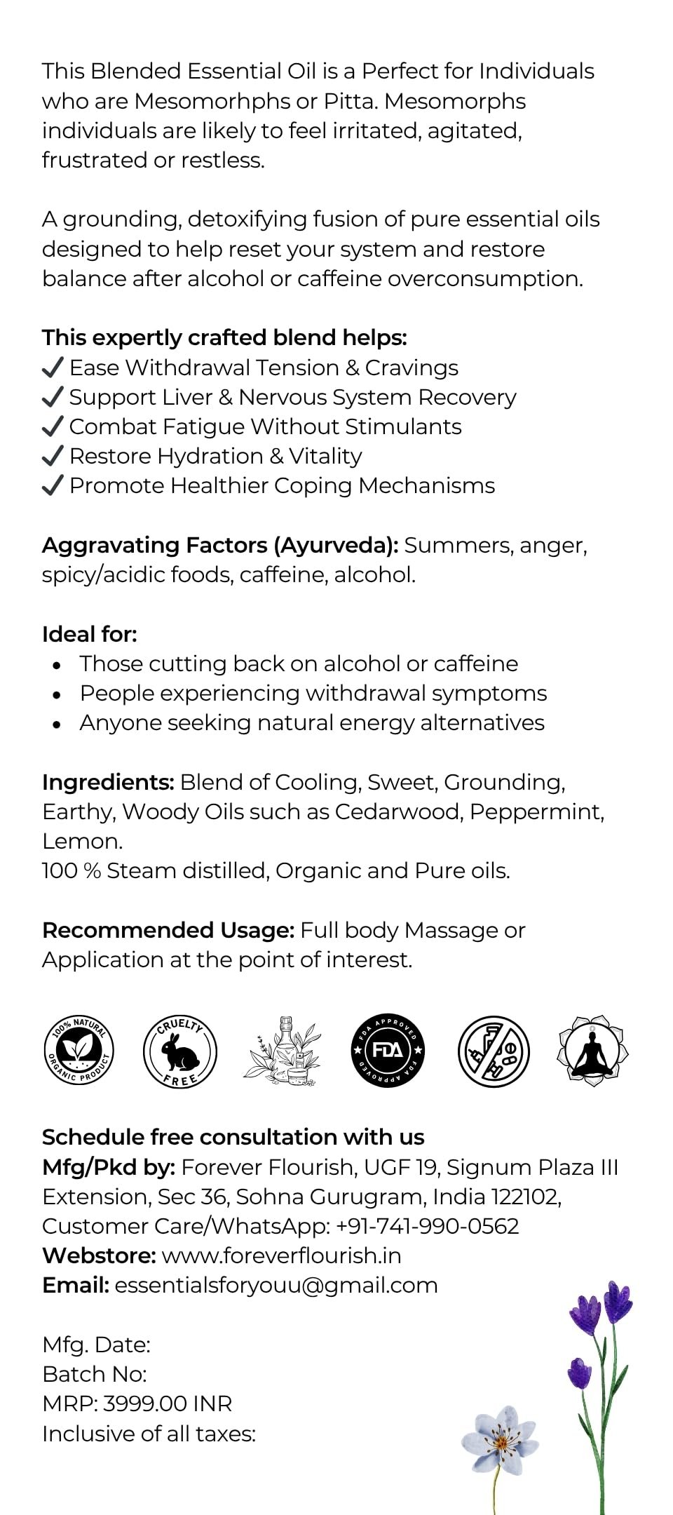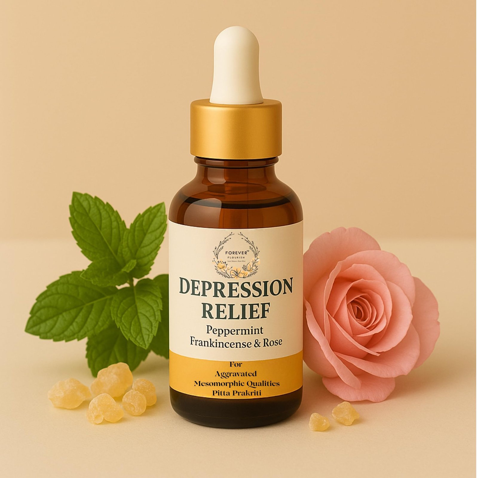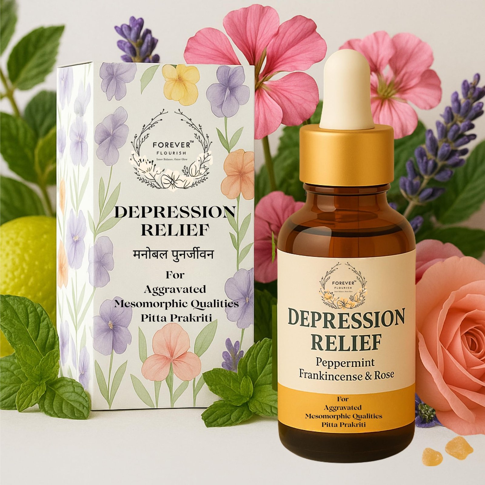 Forever Flourish Depression Relief – Pitta Blend is a calming, soul-soothing essential oil blend designed using Ayurvedic principles to bring emotional harmony to individuals with aggravated Pitta dosha. Characterized by intensity, heat, and overdrive, Pitta imbalances can lead to irritability, frustration, and mood dips. This carefully selected blend features Italian Bergamot for mood elevation, Peppermint to cool the senses, Geranium and Bulgarian Rose to open the heart, and Lavender, Cedarwood, and Sandalwood for grounding and peace. Whether you use it in a diffuser, apply with a carrier oil, or include in your evening self-care ritual, this blend helps reset emotional patterns and promote tranquility from within. Use For: Emotional cooling, mood support, anxiety relief, and dosha balancing.